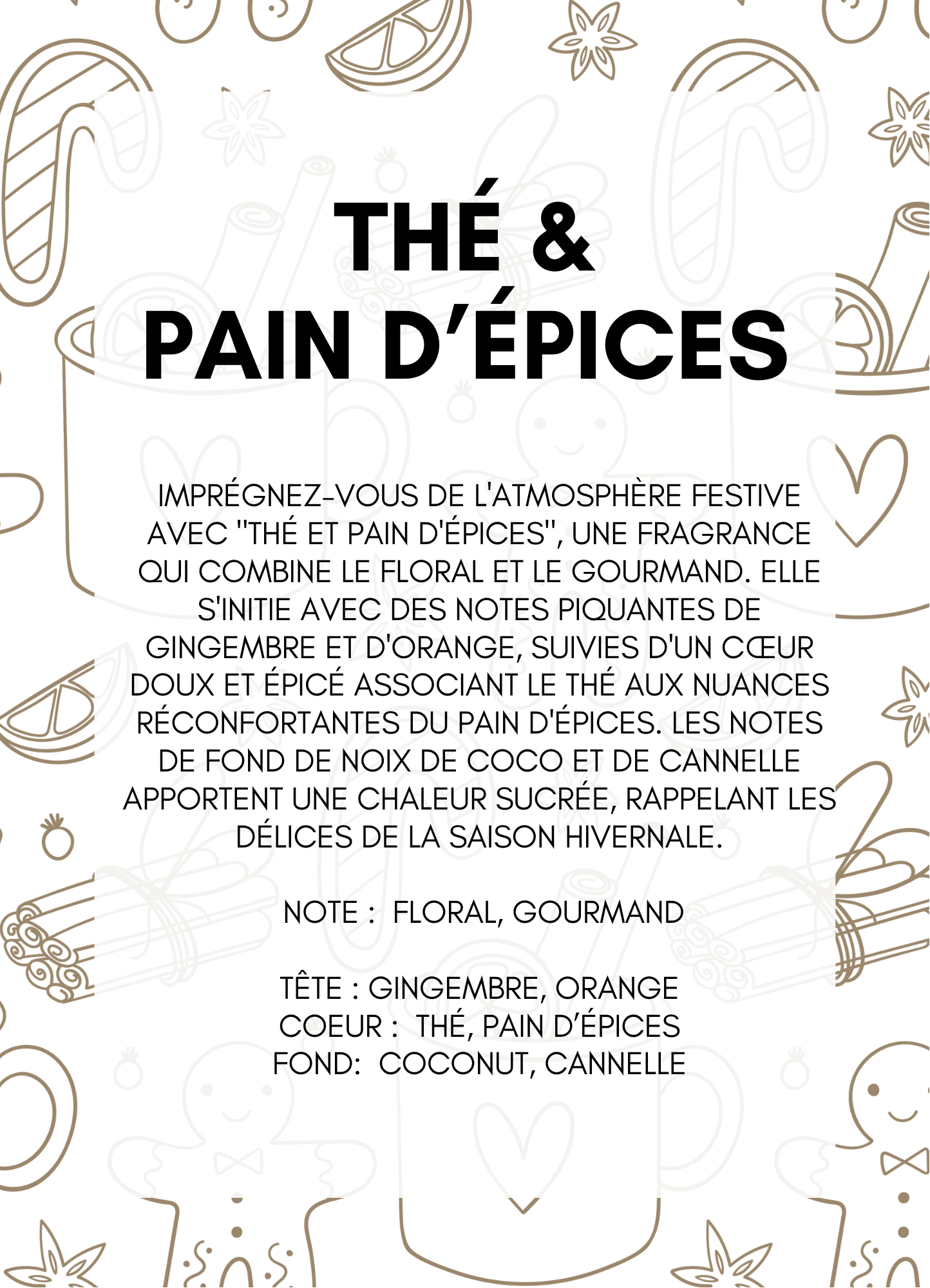 Imprégnez-vous de l’atmosphère festive avec la Bougie Thé et Pain d’Épices, une fragrance qui combine le floral et le gourmand. Elle s’initie avec des notes piquantes de gingembre et d’orange, suivies d’un cœur doux et épicé associant le thé aux nuances réconfortantes du pain d’épices. Les notes de fond de noix de coco et de cannelle apportent une chaleur sucrée, rappelant les délices de la saison hivernale.Retrouvez la Bougie Thé et Pain d’Épices Deux formats : un grand verre noir qui vous dévoilera un intérieur or pour 50h de diffusion ou un verre ambré pour 40h de diffusion.
