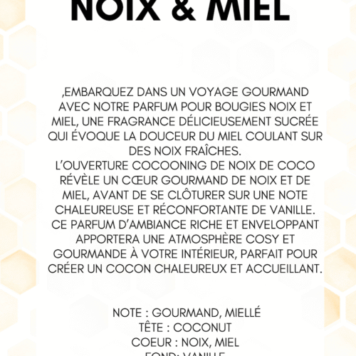 Embarquez dans un voyage gourmand avec notre Bougie Noix et miel, une fragrance délicieusement sucrée qui évoque la douceur du miel coulant sur des noix fraîches.