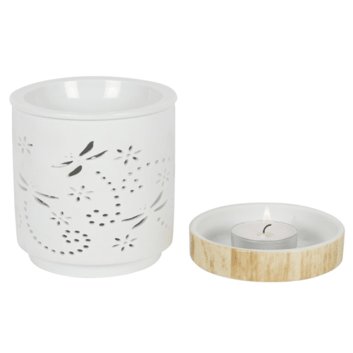 ld Brûleur Libellule se placera idéalement dans votre intérieur avec son design chic et épuré. Ce Brûleur Libelluleen céramique blanche présente un motif découpé représentant des libellules avec une base en céramique effet bois.