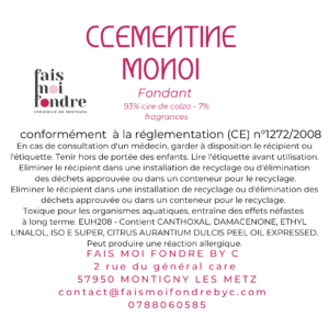 Conservez vos bougies à l’abri de la lumière, de la chaleur et de l’humidité. Vous retrouverez à l’arrière de chaque fondant et coffret une CLP, étiquetage pour vous garantir la transparence des senteurs utilisées et être aux normes obligatoires.