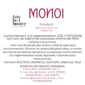 Conservez vos bougies à l’abri de la lumière, de la chaleur et de l’humidité. Vous retrouverez à l’arrière de chaque fondant et coffret une CLP, étiquetage pour vous garantir la transparence des senteurs utilisées et être aux normes obligatoires.